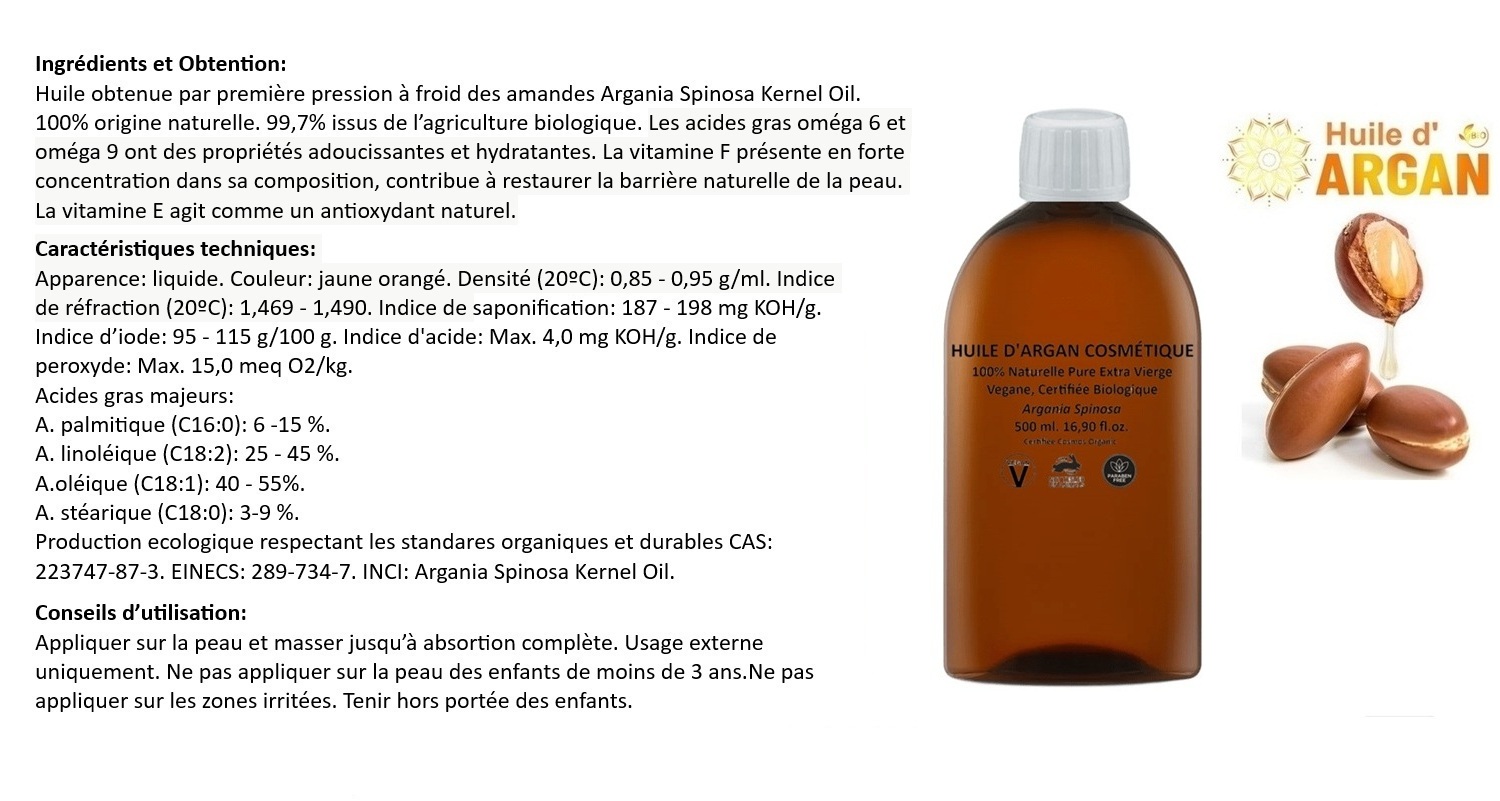 Se obtiene mediante la primera presión en frío de las almendras de Argania spinosa, una especie endémica del suroeste de Marruecos. Los ácidos grasos omega 6 y omega 9, cuentan con propiedades suavizantes e hidratantes. La vitamina F que se encuentra en una alta concentración en su composición, ayuda a restaurar la barrera natural de la piel. La vitamina E actúa como antioxidante natural. El aceite vegetal de argán es un producto 100% natural procedente de la agricultura ecológica.