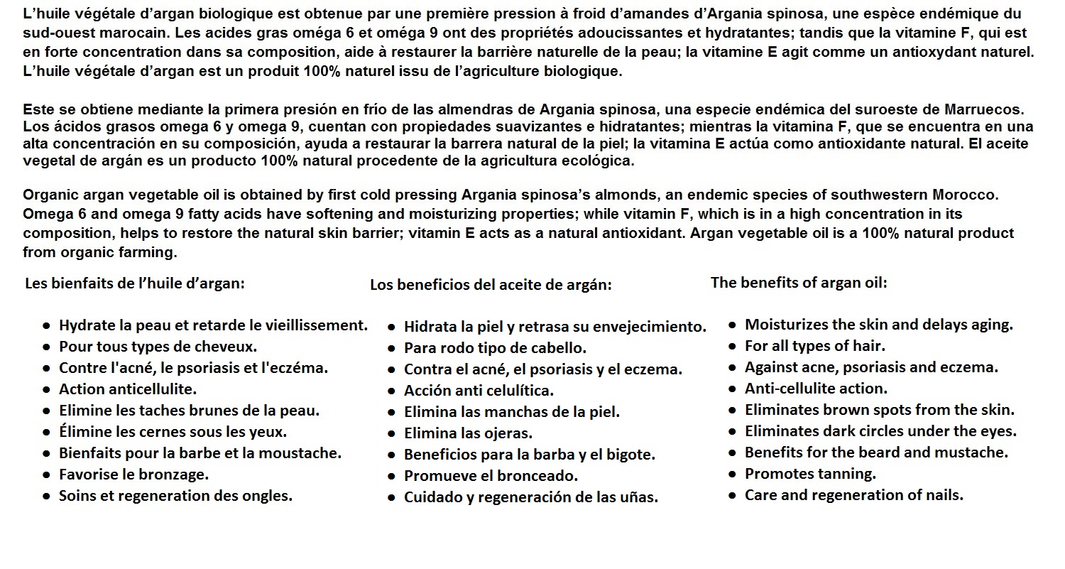 El Aceite de Argán Cosmético Virgen 100% Puro Biológico es ultra nutritivo. Rico en caroteno, estimula la producción de queratina, protege la piel y ayuda a activar el bronceado rápidamente.